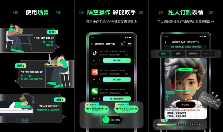 通过手势嘴部动作变化就可以隔空操作手机。吃饭的时候再也不需要腾出一只手拿手机刷抖音了,实在太好用啦!全球首创,体验科技新奇迹。