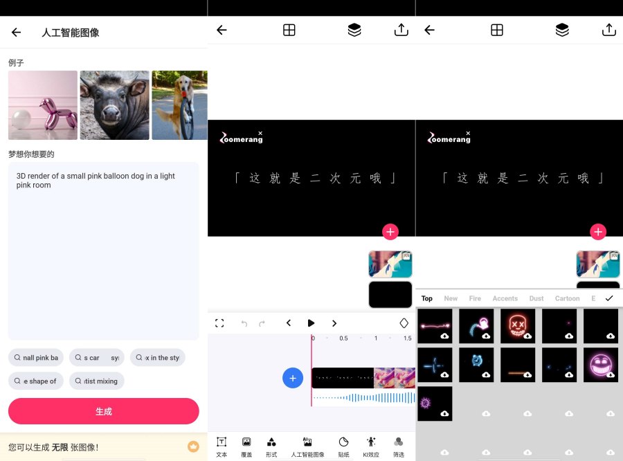 Zoomerang「国际版名叫:VIVA video editor」是一款全能简易的手机视频剪辑应用,无论是一键生成主题视频、添加胶片滤镜,还是修剪、变速、配乐,为视频增添字幕、动画贴纸、视频特效、转场以及进阶调色,制作画中画、GIF 视频,均可以使用小影轻松完成。小影拥有独家「视频美颜」+ 海量「动画贴纸」+ 超强「视频剪辑」,创意、酷炫的视频特效,萌萌哒的动画贴纸和字幕,400+个视频素材等你来下载!而且每个视频都能上热门呢~!