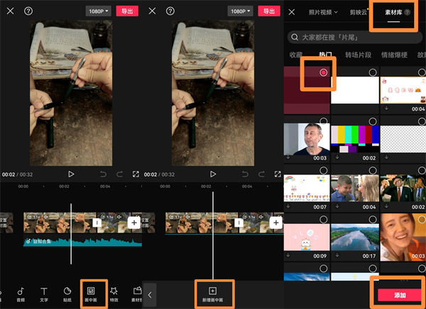 有一个画中画,点一下新增画中画,新增之后点一下素材库,点到素材库之后有黑白布,点黑布添加上面去,添加之后会把视频遮掉,可以移到上面,移到上面之后发现太小了,可以用两只手往两边拉大,拉到我们需要的位置,拉好之后把长度拉到和镜头长度一样长,选择好合适的位置。