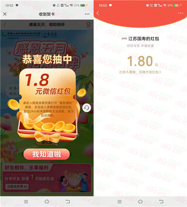今天没啥羊毛,只能发一发3毛项目和一些非必中的羊毛活动,也是没办法的事情。 江苏国寿举办的感恩五月相知相伴拆礼盒抽红包活动,通过打开微信进去活动里,在活动里直接下拉到底拆开礼盒进行抽奖,每天微信每天只有1次机会,只认微信红包,中到其他的没用,如果中了就是1.8元,中到的微信红包目前秒推,非必中。 小编提示:在活动里直接下拉到底拆开礼盒进行抽奖,每天微信每天只有1次机会,只认微信红包,中到其他的没用,非必中 活动地址:微信打开:https://sourl.cn/fsJGeX
